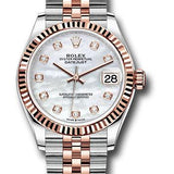 31mm Everose Rolesor case comprised of Oystersteel and 18K Everose gold, screw-down back, screw-down crown with twinlock double waterproofness system, 18K Everose gold fluted bezel, scratch-resistant sapphire crystal with cyclops lens over the date, white mother-of-pearl dial, diamond hour markers, Rolex calibre 2236 perpetual self-winding movement with date at 3 o'clock, approximately 55 hours of power reserve, Everose Rolesor Jubilee bracelet with semi-circular three-piece links, concealed folding Crownclasp buckle. Waterproof to 100 meters. Baselworld 2019 release.
