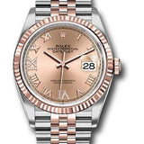 36mm Everose Rolesor case with Oystersteel monobloc middle case, screw-down steel back, screw-down 18K Everose crown, 18K Everose fluted bezel, rose dial, Roman numerals with diamond set 6 and 9, Rolex calibre 3235 self-winding movement with date at 3 o'clock, approximately 70 hours of power reserve, Everose Rolesor Jubilee bracelet with five-piece links, folding Oysterclasp buckle with Easylink 5mm comfort extension link. Waterproof to 100 meters. Redesigned for Baselworld 2018 with updated case sides, lugs, and calibre 3235 movement.