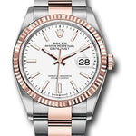 36mm Everose Rolesor case with Oystersteel monobloc middle case, screw-down steel back, screw-down 18K Everose crown, 18K Everose fluted bezel, white dial, index hour markers with Chromalight, Rolex calibre 3235 self-winding movement with date at 3 o'clock, approximately 70 hours of power reserve, Everose Rolesor Oyster bracelet with flat three-piece links, folding Oysterclasp buckle with Easylink 5mm comfort extension link. Waterproof to 100 meters. Redesigned for Baselworld 2018 with updated case sides, lugs, and calibre 3235 movement.