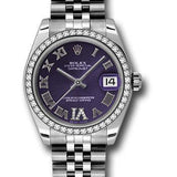 31mm stainless steel case, screw-down crown, 18K white gold bezel set with 46 diamonds, scratch-resistant sapphire crystal with cyclops lens over the date, purple diamond Roman VI dial, Roman numerals with 11 diamonds set on VI, Rolex calibre 2235 automatic movement, approximately 48 hours of power reserve, Jubilee bracelet with five-piece links, concealed folding Crownclasp buckle. Waterproof to 100 meters.