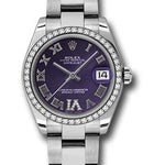 31mm stainless steel case, screw-down crown, 18K white gold bezel set with 46 diamonds, scratch-resistant sapphire crystal with cyclops lens over the date, purple diamond Roman VI dial, Roman numerals with 11 diamonds set on VI, Rolex calibre 2235 automatic movement, approximately 48 hours of power reserve, Oyster bracelet with flat three-piece links, folding Oysterclasp buckle with Easylink 5mm comfort extension link. Waterproof to 100 meters.