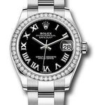 31mm white Rolesor case comprised of Oystersteel and 18K white gold, screw-down back, screw-down crown with twinlock double waterproofness system, 18K white gold bezel set with 46 diamonds, scratch-resistant sapphire crystal with cyclops lens over the date, black dial, Roman numerals, Rolex calibre 2236 perpetual self-winding movement with date at 3 o'clock, approximately 55 hours of power reserve, Oystersteel Oyster bracelet with flat three-piece links, concealed folding Oysterclasp buckle. Waterproof to 100 meters.