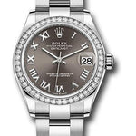31mm white Rolesor case comprised of Oystersteel and 18K white gold, screw-down back, screw-down crown with twinlock double waterproofness system, 18K white gold bezel set with 46 diamonds, scratch-resistant sapphire crystal with cyclops lens over the date, dark grey dial, Roman numerals, Rolex calibre 2236 perpetual self-winding movement with date at 3 o'clock, approximately 55 hours of power reserve, Oystersteel Oyster bracelet with flat three-piece links, concealed folding Oysterclasp buckle. Waterproof to 100 meters.