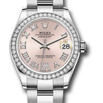 31mm white Rolesor case comprised of Oystersteel and 18K white gold, screw-down back, screw-down crown with twinlock double waterproofness system, 18K white gold bezel set with 46 diamonds, scratch-resistant sapphire crystal with cyclops lens over the date, pink dial, Roman numerals with diamond set 6, Rolex calibre 2236 perpetual self-winding movement with date at 3 o'clock, approximately 55 hours of power reserve, Oystersteel Oyster bracelet with flat three-piece links, concealed folding Oysterclasp buckle. Waterproof to 100 meters.