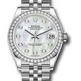 31mm white Rolesor case comprised of Oystersteel and 18K white gold, screw-down back, screw-down crown with twinlock double waterproofness system, 18K white gold bezel set with 46 diamonds, scratch-resistant sapphire crystal with cyclops lens over the date, white mother-of-pearl dial, diamond hour markers, Rolex calibre 2236 perpetual self-winding movement with date at 3 o'clock, approximately 55 hours of power reserve, Oystersteel Jubilee bracelet with five-piece links, concealed folding Crownclasp buckle. Waterproof to 100 meters.