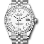 31mm white Rolesor case comprised of Oystersteel and 18K white gold, screw-down back, screw-down crown with twinlock double waterproofness system, 18K white gold bezel set with 46 diamonds, scratch-resistant sapphire crystal with cyclops lens over the date, white dial, Roman numerals, Rolex calibre 2236 perpetual self-winding movement with date at 3 o'clock, approximately 55 hours of power reserve, Oystersteel Jubilee bracelet with five-piece links, concealed folding Crownclasp buckle. Waterproof to 100 meters.