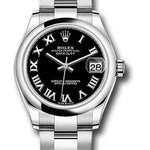 31mm Oystersteel case, screw-down back, screw-down crown with twinlock double waterproofness system, domed bezel, scratch-resistant sapphire crystal with cyclops lens over the date, black dial, Roman numerals, Rolex calibre 2236 perpetual self-winding movement with date at 3 o'clock, approximately 55 hours of power reserve, Oystersteel Oyster bracelet with flat three-piece links, concealed folding Oysterclasp buckle. Waterproof to 100 meters.