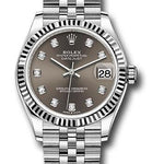31mm white Rolesor case comprised of Oystersteel and 18K white gold, screw-down back, screw-down crown with twinlock double waterproofness system, 18K white gold fluted bezel, scratch-resistant sapphire crystal with cyclops lens over the date, dark grey dial, diamond hour markers, Rolex calibre 2236 perpetual self-winding movement with date at 3 o'clock, approximately 55 hours of power reserve, Oystersteel Jubilee bracelet with five-piece links, concealed folding Crownclasp buckle. Waterproof to 100 meters.