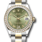31mm yellow Rolesor case comprised of Oystersteel and 18K yellow gold, screw-down back, screw-down crown with twinlock double waterproofness system, 18K yellow gold bezel set with diamonds, scratch-resistant sapphire crystal with cyclops lens over the date, olive green dial, Roman numerals with 11 diamonds set on VI, Rolex calibre 2236 perpetual self-winding movement with date at 3 o'clock, approximately 55 hours of power reserve, yellow Rolesor Oyster bracelet made from a combination of 904L steel and 18K yellow gold with flat three-piece links, folding Oysterclasp buckle with Easylink 5mm comfort extension link. Waterproof to 100 meters. Baselworld 2019 release.
