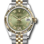 31mm yellow Rolesor case comprised of Oystersteel and 18K yellow gold, screw-down back, screw-down crown with twinlock double waterproofness system, 18K yellow gold fluted bezel, scratch-resistant sapphire crystal with cyclops lens over the date, olive green dial, Roman numerals with 11 diamonds set on VI, Rolex calibre 2236 perpetual self-winding movement with date at 3 o'clock, approximately 55 hours of power reserve, yellow Rolesor Jubilee bracelet with semi-circular three-piece links, concealed folding Crownclasp buckle. Waterproof to 100 meters. Baselworld 2019 release.