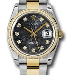 36mm stainless steel case, 18K yellow gold screw-down crown, 18K yellow gold bezel set with 52 brilliant-cut diamonds, scratch-resistant sapphire crystal with cyclops lens over the date, black Jubilee dial, diamond hour markers, Rolex calibre 3135 automatic movement, stainless steel and 18K yellow gold Oyster bracelet with three-piece links, folding Oysterclasp buckle with Easylink 5mm comfort extension link. Waterproof to 100 meters.