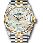 36mm yellow Rolesor case with Oystersteel monobloc middle case, screw-down steel back, screw-down 18K yellow crown, 18K yellow fluted bezel, white mother-of-pearl dial, 10 diamond hour markers, Rolex calibre 3235 self-winding movement with date at 3 o'clock, approximately 70 hours of power reserve, yellow Rolesor Jubilee bracelet with five-piece links, folding Oysterclasp buckle with Easylink 5mm comfort extension link. Waterproof to 100 meters. Redesigned for Baselworld 2018 with updated case sides, lugs, and calibre 3235 movement.