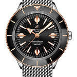 42.00 mm stainless steel and 18K red gold case, non screw-locked crown with two gaskets, bidirectional bezel, cambered sapphire crystal with glareproof treatment on both sides, black dial, Breitling 10 self-winding movement, approximately approx. 42 hours of power reserve, metal bracelet. Water resistant to 100 m (330 ft).