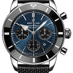 44.00 mm steel case, 15.50 mm thick, transparent sapphire crystal back, screw-locked crown with two gaskets, unidirectional ratcheted bezel, cambered sapphire crystal with glareproof treatment on both sides, blackeye blue dial, Breitling 01 (Manufacture) self-winding movement, approximately 70 hrs of power reserve, black rubber aero classic strap, pushbutton folding buckle. Water resistant to 200 m (660 ft).