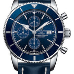46.00 mm stainless steel case, 16.35 mm thick, screw-locked crown with two gaskets, unidirectional ratcheted rotating bezel, cambered sapphire crystal with glareproof treatment on both sides, gun blue dial, Breitling 13 selfwinding movement, approximately 48 hrs of power reserve, blue leather strap, folding buckle. Water resistant to 200 m (660 ft).