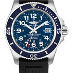 42.00 mm stainless steel case, screw-locked crown with two gaskets, unidirectional ratcheted bezel with blue rubber insert, cambered sapphire crystal with glareproof treatment on both sides, Mariner blue dial, selfwinding mechanical Breitling 17 movement with date display, 40 hours of power reserve, black Diver Pro III strap with tang-type buckle. Water resistant to 500 m (1,650 ft).