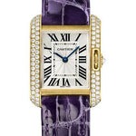 30.2mm x 22.7mm 18K yellow gold case set with diamonds, 7.19mm thick, nine sided crown with a cut diamond, sapphire crystal, silvered dial with blued steel hands, caliber Cartier 057 quartz movement, aubergine alligator strap, double adjustable deployant buckle with 18K yellow gold. Water resistant to 30 meters.