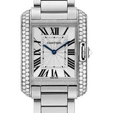 34.7mm x 26.2mm 18K white gold case set with brilliant-cut diamonds, 7.1mm thick, 9-sided crown set with a brilliant-cut diamond, 18K white gold bezel set with a brilliant-cut diamonds, silver dial set with brilliant-cut diamonds, quartz movement with blued-steel sword-shaped hands, 18K white gold bracelet. Water resistant to 3 bar.