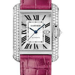 39.2mm x 29.8mm 18K white gold case set with diamonds, 9.5mm thick, nine sided crown with a cut diamond, sapphire crystal, silvered dial with blued steel hands, caliber Cartier 077 automatic movement, fuschia alligator strap, double adjustable deployant buckle with 18K white gold . Water resistant to 30 meters.