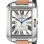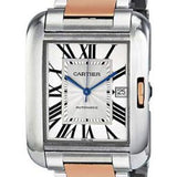 Large size (47mm x 36.2mm) stainless steel and 18K pink gold case, nine-sided crown set with a synthetic spinel cabochon, sapphire crystal, slivered and lacquered flinque dial with Roman numerals and sword-shaped blued-steel hands, self-winding caliber Cartier 1904MC movement, stainless steel and 18K pink gold bracelet. Water resistant to 30 meters.