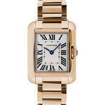 Small size (30.2mm x 22.7mm) 18K pink gold case, nine-sided crown set with a sapphire, sapphire crystal, slivered and lacquered flinque dial with Roman numerals and sword-shaped blued-steel hands, quartz caliber Cartier 057 movement, 18K pink gold bracelet. Water resistant to 30 meters.