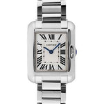Small size (30.2mm x 22.7mm) stainless steel case, nine-sided crown set with a synthetic spinel cabochon, sapphire crystal, flinque and silvered dial with Roman numerals and blued steel sword-shaped blued-steel hands, quartz caliber Cartier 057 movement, polished stainless steel bracelet with satin-finished central links. Water resistant to 30 meters.