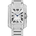 Small size (30.2mm x 22.7mm) rhodiumized 18K white gold case set with brilliant-cut diamonds, nine-sided crown set with a brilliant-cut diamond, sapphire crystal, slivered and lacquered flinque dial with Roman numerals and sword-shaped blued-steel hands, quartz caliber Cartier 057 movement, rhodiumized 18K white gold bracelet set with brilliant-cut diamonds. Water resistant to 30 meters.