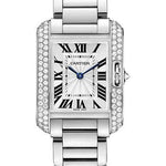 Small size (30.2mm x 22.7mm) rhodiumized 18K white gold case set with brilliant-cut diamonds, nine-sided crown set with a brilliant-cut diamond, sapphire crystal, slivered and lacquered flinque dial with Roman numerals and sword-shaped blued-steel hands, quartz caliber Cartier 057 movement, rhodiumized 18K white gold bracelet. Water resistant to 30 meters.