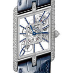 47.15 mm x 26.20 mm platinum case set with 251 brilliant-cut diamonds, crown set with 251 brilliant-cut diamonds totaling 2.21 carats, skeleton dial, caliber 9623 MC manual movement, approximately 48 hours of power reserve, 2 navy blue and black alligator-skin strap, brancards, buckle. Water resistant to 3 bar (approx 30 meters/100 feet).