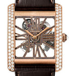 34.5mm x 43.8mm 18K pink gold case set with 82 brilliant-cut diamonds totaling 1.96K, 9.3mm thick, sapphire back, fluted 18K pink gold crown set with a faceted brilliant-cut diamond of 0.15K, 18K pink gold bezel set with 82 brilliant-cut diamonds totaling 1.96K, sapphire crystal, pink gold dial, caliber 9619 manual-winding movement with gilded-steel sword-shaped hands, approximately 3 days of power reserve, brown alligator skin strap, double adjustable folding buckle set with 46 brilliant-cut diamonds totaling 0.45K. Water resistant to 3 bar.