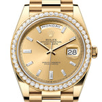 The Rolex Day-Date 40 in an illustrious Yellow Gold President's configuration, featuring a resplendent Champagne Baguette Diamonds Dial, epitomizes timeless sophistication, luxury, and unparalleled craftsmanship.