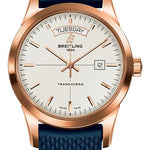 Breitling Transocean Day & Date Watch - 18k Red Gold - Mercury Silver Dial - Blue Rubber Aero Classic Strap - R4531012/G752/281S/R20D.3