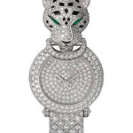 23.6 mm rhodiumized 18K white gold case set with 136 brilliant-cut diamonds, 7.7 mm thick, rhodiumized 18K white gold dial set with 117 diamonds totaling 0.54 carat, quartz movement, rhodiumized white gold bracelet set with 270 brilliant-cut diamonds totaling 9.19 carat. Water resistant to 3 bar (approx 30 meters/100 feet).