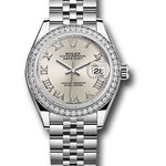 28mm white Rolesor case comprised of a 904L steel monobloc middle case, screw-down steel back, screw-down crown with twinlock double waterproofness system, 18K white gold fluted bezel set with 44 diamonds, scratch-resistant sapphire crystal with cyclops lens over the date and double anti-reflective coating, silver dial, Roman numerals, Rolex calibre 2236 automatic movement with center hour, minute and seconds hands, instantaneous date with rapid setting, and stop-seconds for precise time setting, stainless steel Jubilee bracelet with five-piece links, concealed folding Crownclasp buckle. Waterproof to 100 meters.
