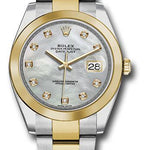 41mm Yellow Rolesor case with 904L steel monobloc middle case, screw-down steel back, 18K yellow gold screw-down crown, 18K yellow gold smooth bezel, scratch-resistant double anti-reflective sapphire crystal with cyclops lens over the date, mother-of-pearl dial, diamond hour markers, Rolex calibre 3235 perpetual self-winding movement with date at 3 o'clock that changes instantaneously at midnight in a few thousandths of a second, approximately 70 hours of power reserve, yellow Rolesor Oyster bracelet made from a combination of 904L steel and 18K yellow gold with flat three-piece links, folding Oysterclasp buckle with Easylink 5mm comfort extension link. Waterproof to 100 meters.